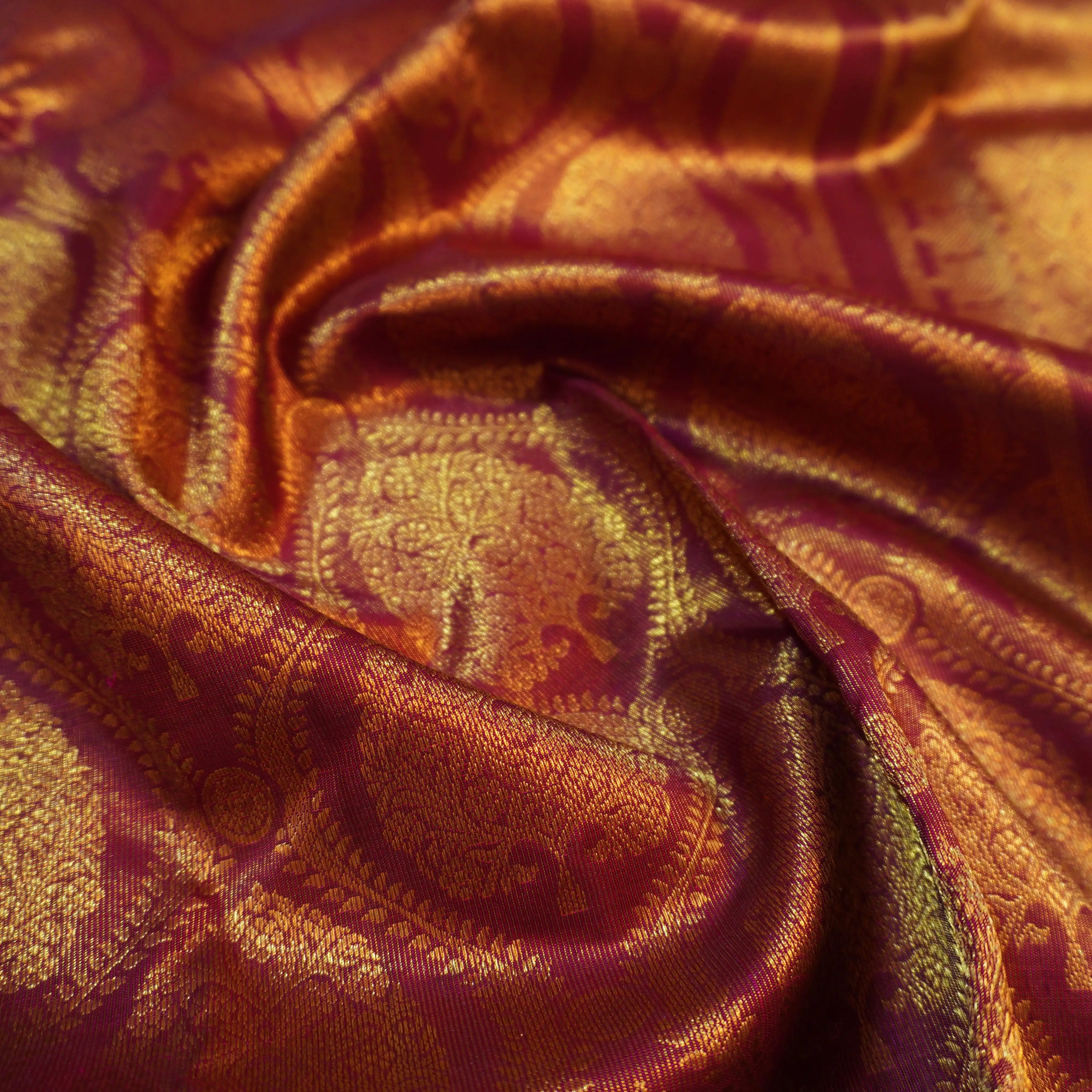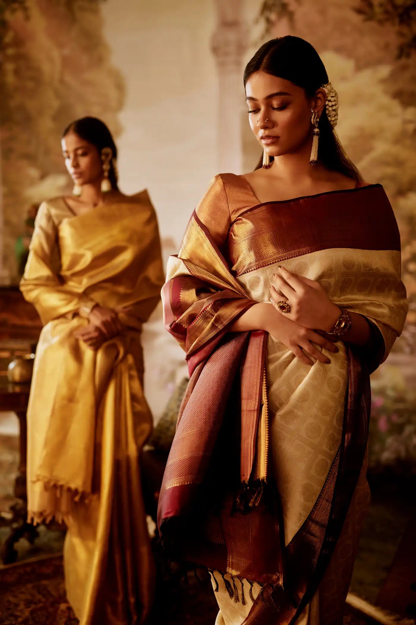 Traditional Kanchipuram silk sarees are woven from pure mulberry silk. While the silk belongs to South India, the pure gold and silver zari comes from Gujarat. The silk thread is then interlocked with a thin silver wire and woven through after which a golden thread is used to complete the procedure.