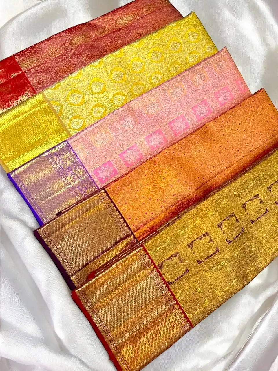 ● Bridal Kanchipuram Silk Sarees – Adorned with intricate zari work using silver and gold threads.